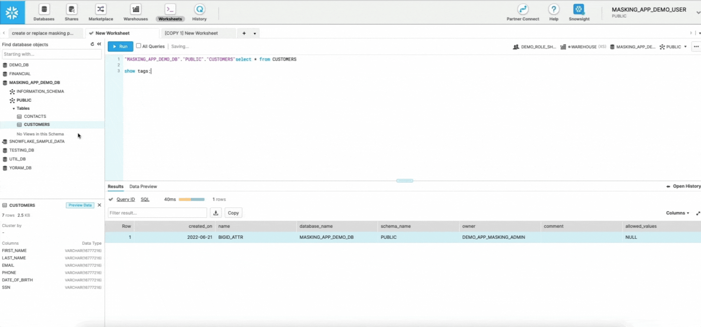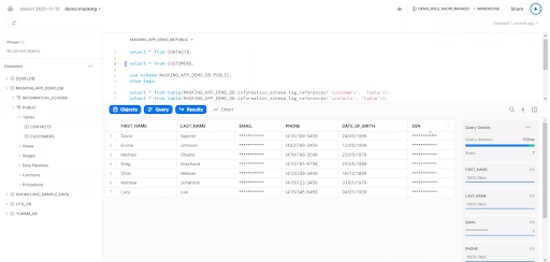 Apply native dynamic data masking with role-based access control (RBAC) and attribute-based access control (ABAC) to automatically tell Snowflake what to mask.