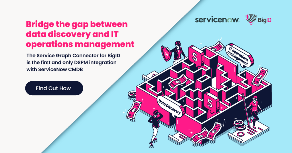Organizations face significant challenges in managing and securing their data assets across complex IT environments. The rising volume of sensitive information and the proliferation of data sources necessitate comprehensive solutions for complete visibility and control. Our new ServiceGraph Connector for BigID tackles these challenges by seamlessly integrating Data Security Posture Management (DSPM) capabilities with ServiceNow’s IT operations management platform, enabling comprehensive data visibility, enhanced security posture, and streamlined IT operations.