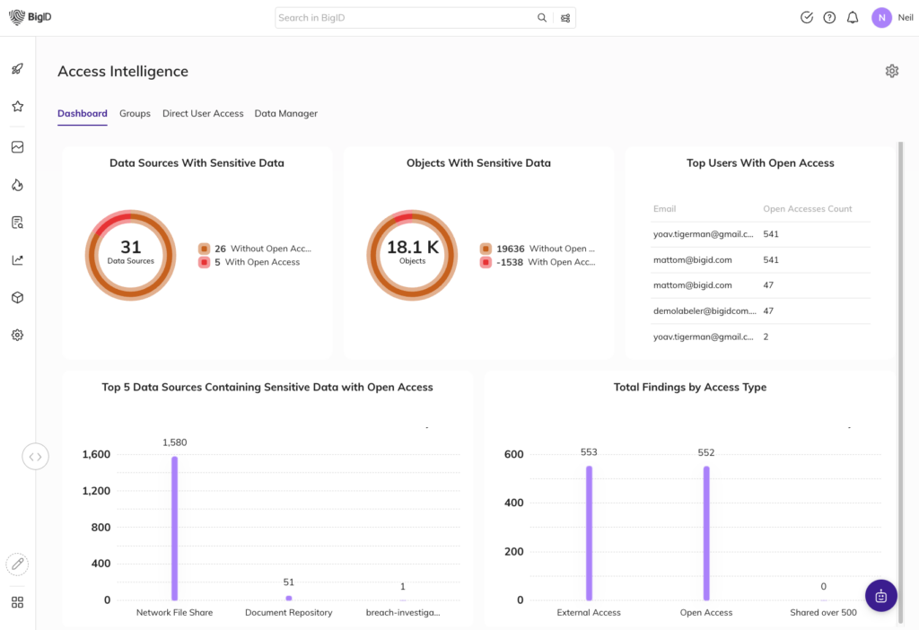 With BigID, identify and remediate unwanted overexposure across the cloud and on prem to give your security team a more holistic and easy way to manage access across the entire environment. Identify sensitive, critical, regulated, and personal data that is exposed internally and externally. Find users and groups with unfettered access to sensitive data. Then proactively reduce overexposure by kicking off remediation workflows to mitigate excessive and unwanted access.