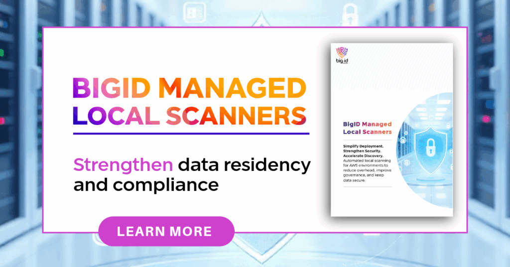 With Managed Local Scanners, BigID empowers enterprises to simplify deployment, accelerate insight, and maintain control over their most sensitive data. Set up a 1:1 with one of our BigID experts today to learn more!