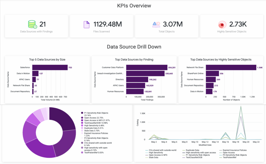 - Monitor sensitive data trends, risk reduction efforts, and incident response performance