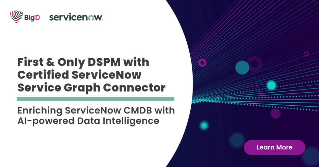BigID addresses this challenge as the first and only Data Security Posture Management (DSPM) platform with a certified ServiceNow Service Graph Connector. This industry-exclusive integration enriches ServiceNow’s Configuration Management Database (CMDB) with advanced data intelligence, delivering unprecedented visibility into data sensitivity and risks directly within existing ServiceNow workflows.