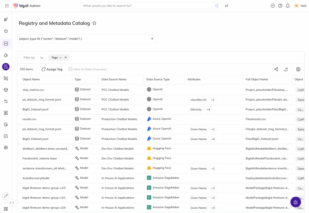 Move beyond AI principles to enforce responsible AI in practice by controlling data access, documenting lineage, and validating compliance across AI initiatives. BigID delivers transparency, auditability, and governance aligned to evolving global AI regulations.
