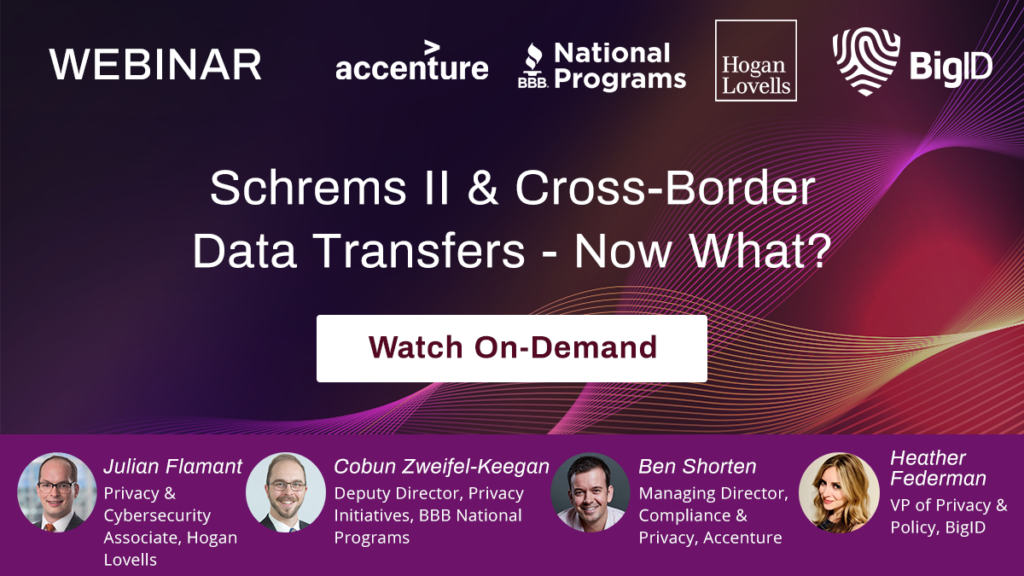 Tune in to this webinar to hear from Hogan Lovells’ Julian Flamant, Accenture’s Ben Shorten, BBB National Program’s Cobun Zweifel-Keegan & BigID’s Heather Federman to hear about top considerations for privacy professionals as they brace themselves from the fallout of Schrems II and what the future holds for cross border data transfers.