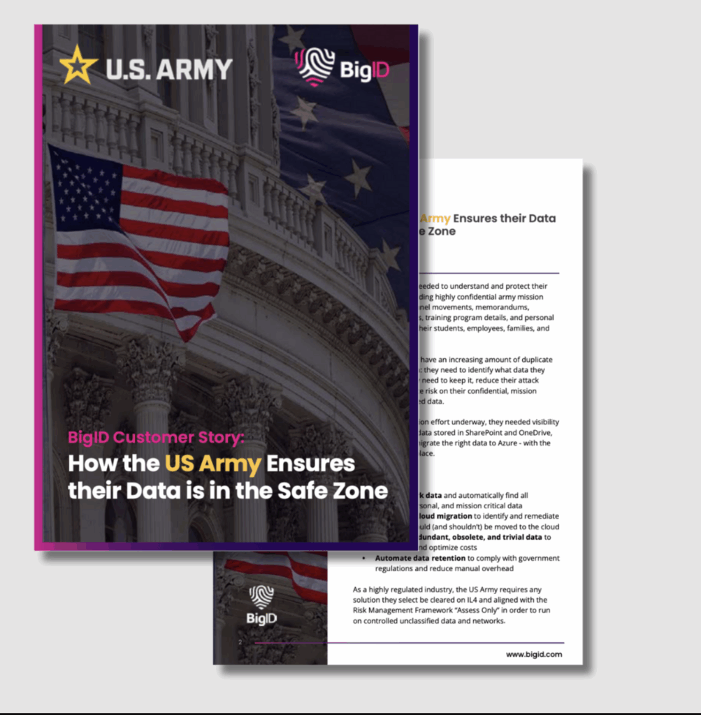 See why the US Army selected BigID to help them manage, monitor, and protect their sensitive data: including confidential mission data, personal information, and sensitive data, across Azure Cloud, Elastic, SQL Server, Oracle DB, Sharepoint, Office 365, and more.