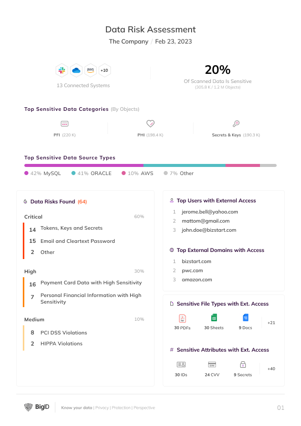 It’s time for an upgrade. Welcome the BigID Data Risk Assessment Report – designed to simplify and streamline data risk assessment reporting in a matter of clicks, wherever your data lives.