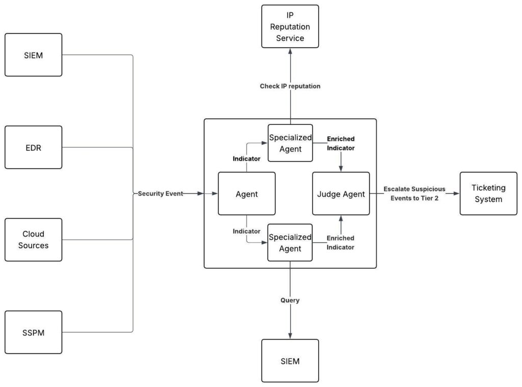 Each agent makes a determinationâmalicious or benign. Once all indicators are evaluated, the system concludes whether the overall event requires tier-2 escalation or should be marked as non-suspicious.