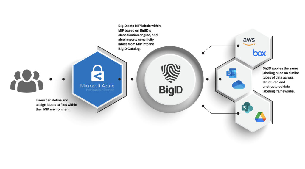 BigID offers the first data catalog that fully integrates with Microsoft Information Protection (MIP) labeling capabilities. With bi-directional synchronization, leverage in-depth discovery and ML-based classification to accurately set MIP labels across all the right data sources — and then have those labels appear within the BigID data catalog. MIP labels set externally are also included and imported into the BigID catalog, creating a single pane of glass for all your data and metadata.