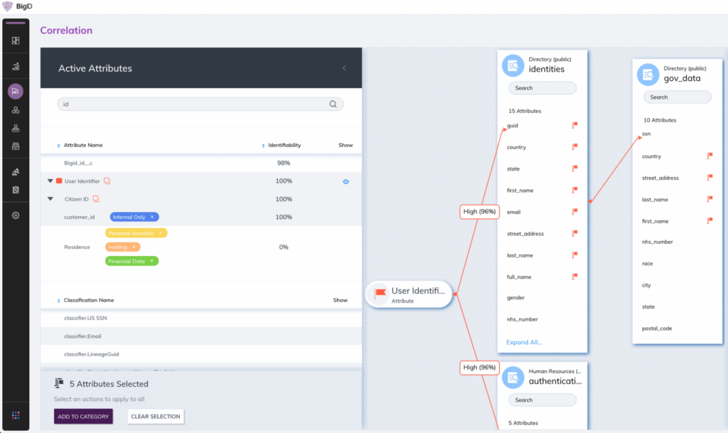 BigIDโs graph technology adds context to classification, surfacing relationships between data points and correlating related data. Build identity and entity profiles, associate whose data it is, and visualize how data is interconnected across data sources.
