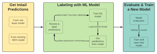 One way to reduce the amount of labeling work is to combine a machine learning model in the annotation process. The approach uses model predictions to pre-annotate new examples, allowing a human to then rapidly review these annotations, confirming or rejecting them as appropriate. This is an iterative process with the following steps: