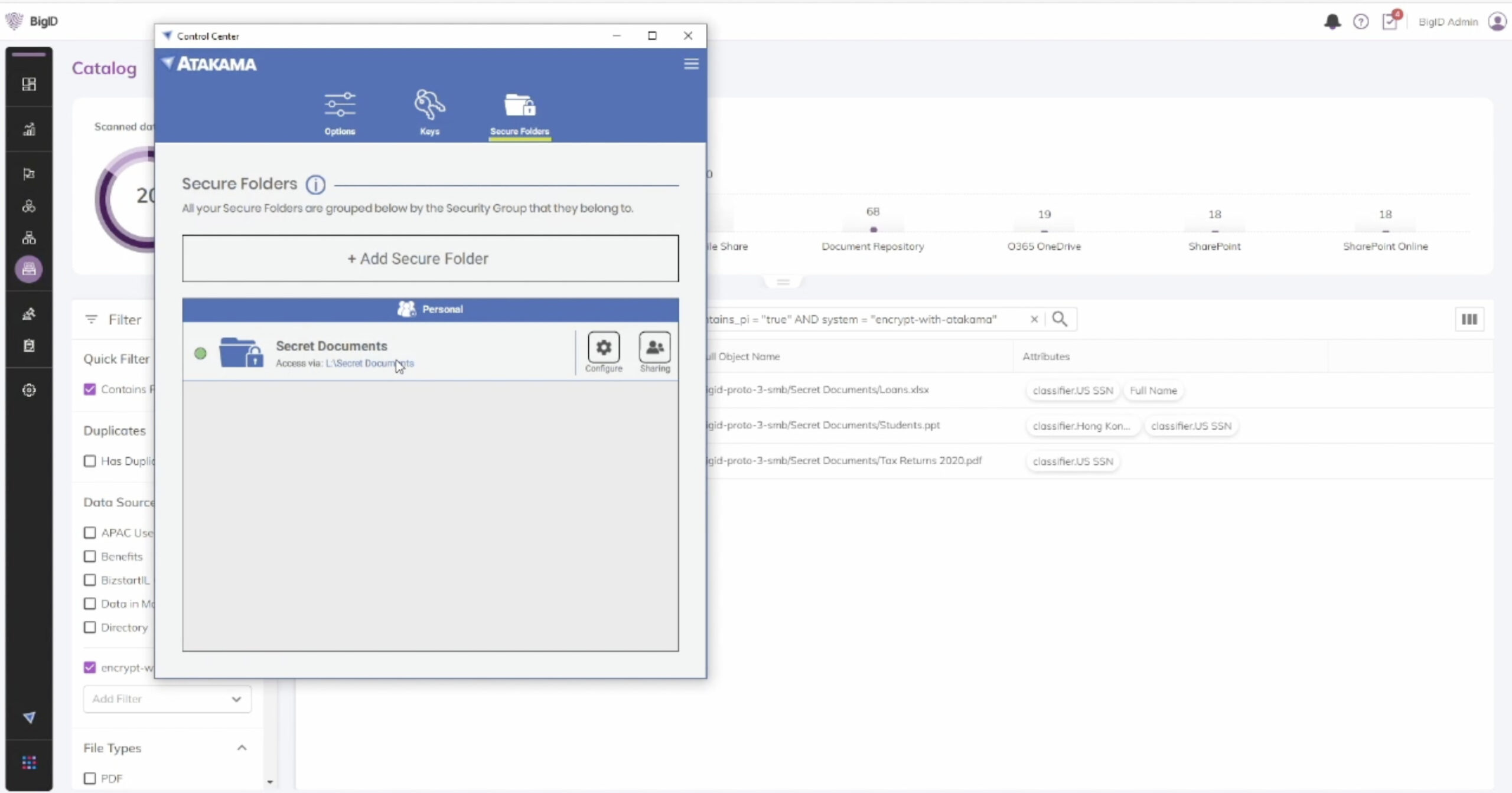 Alongside Atakama, this integration enables organizations to apply adequate safeguards around their data, proactively manage risk, and maintain compliance. The joint solution helps mitigate user error by leveraging BigID’s unparalleled data classification and identification accuracy — plus enabling appropriate controls with Atakama’s innovative multi-factor encryption and distributed key architecture optimized around a data asset’s level of sensitivity. Per defined policies, Atakama protects files by automatically applying file-level encryption without relying on usernames or passwords.