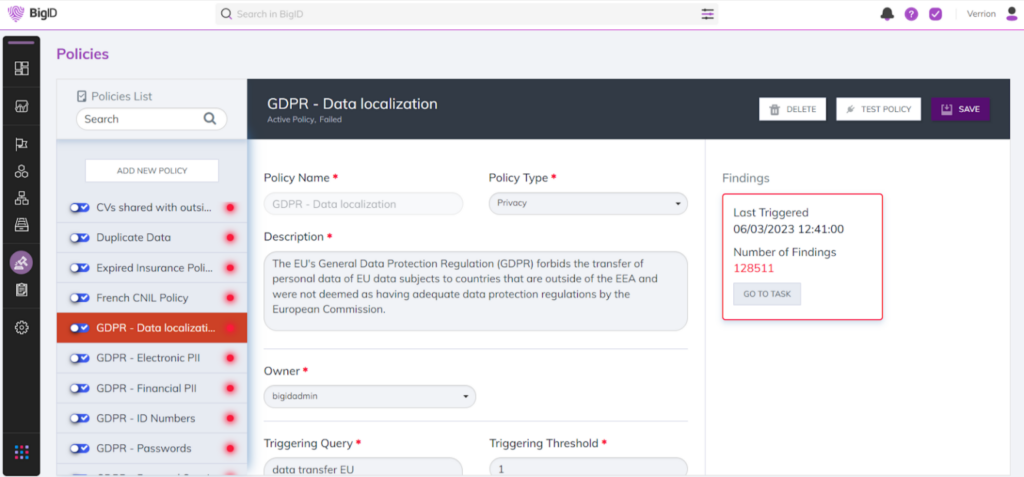 Apply residency to data sources and individual data with OOTB policies to monitor & alert on cross-border data transfers. With BigID, organizations can assess, validate, report, and remediate information by data jurisdictions for compliance with data transfer requirements.
