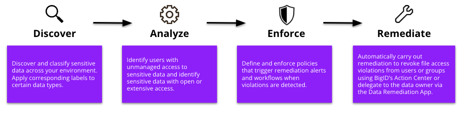 Access Intelligence Remediation effectively automates the access rights violation workflowâ from intelligence down to remediation. The process is simple and can be handled exclusively within BigID. Automatically discover and classify files that contain sensitive data, then implement a policy on what types of data shouldnât have external access. Continually run admin policies across your data, and when violations occur, automatically trigger remediation workflows. Execute revocation of access via the BigID Action Center, or delegate remediation workflows to the correct data sources owner via the Remediation App. Accelerate security operations and mitigate sensitive data risk with certaintyâitâs that easy.