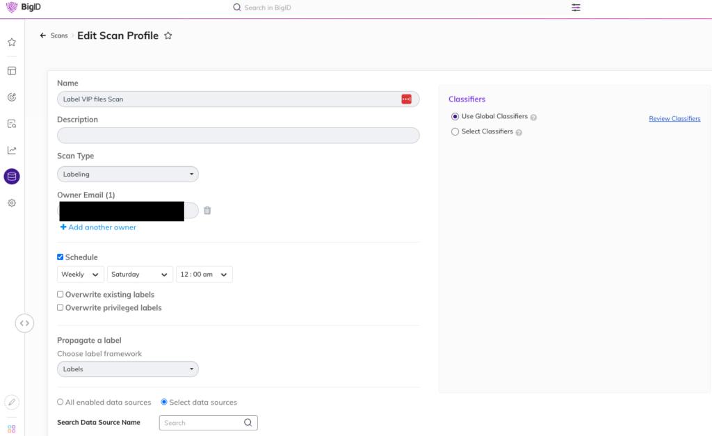 The scan profile is what is needed to be configured in order for the Labeling application to apply the classification labels to the object. As BigID performs scans on the data sources, it will assign the defined sensitivity label based on the query you would like to assign those labels.