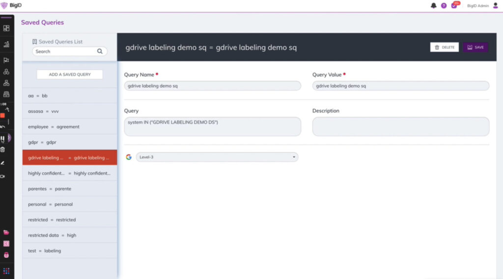 Extend the consistency and accuracy of BigID’s unmatched data labeling capabilities over to your Google Drive environment. Use BigID to determine sensitive or criticality definitions unique to your organization, and then automatically apply equivalent classifications rules, and corresponding labels to files within Drive, using Google’s native labeling framework and workflows. No special Google licenses are required to operate – simply integrate Google Drive with BigID’s Data Labeling app.