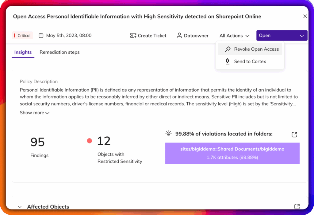 Ne vous contentez pas d'identifier les risques, corrigez-les. Expurgez les secrets, révoquez les autorisations excessives, supprimez les données toxiques et automatisez l'application des règles dans l'ensemble de votre écosystème.