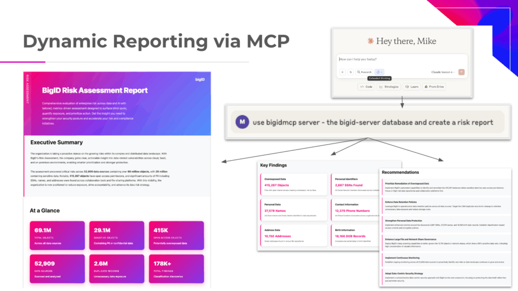 BigID continue à scanner, classer, et enrichissez vos données à travers environnements structurés, non structurés, cloud et sur siteLe serveur MCP rend ensuite ces données accessibles en toute sécurité à partir de n'importe quelle interface native de l'IA.