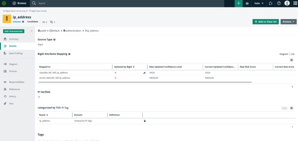 BigID uses AI and ML to define and map critical data elements to Collibra metadata. Import Collibra business glossaries into BigID to map business terms to physical data for increased context and insight. Ongoing feedback loop between Collibra tag propagation, metadata analysis and BigID machine-learning classification.