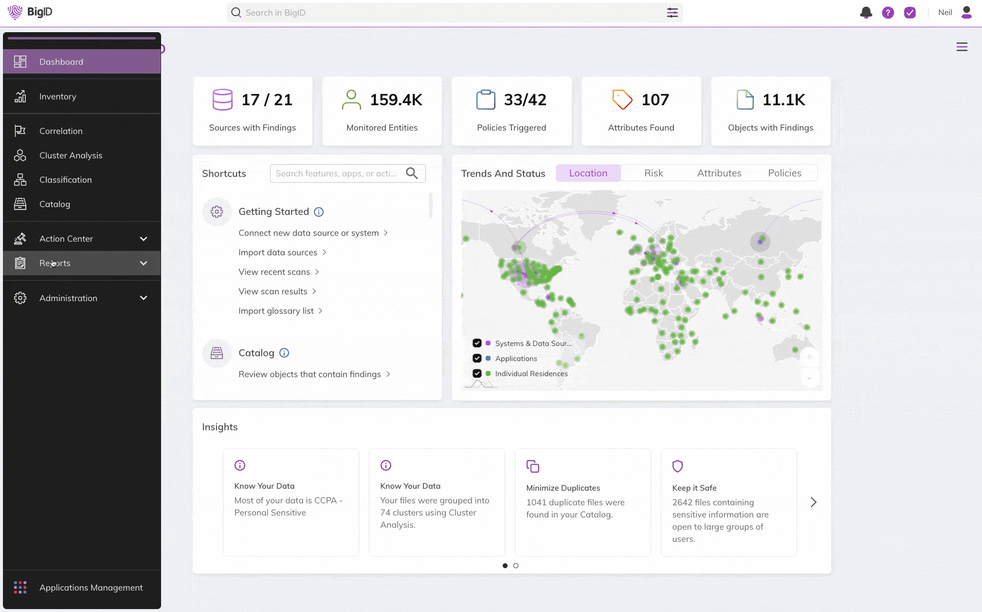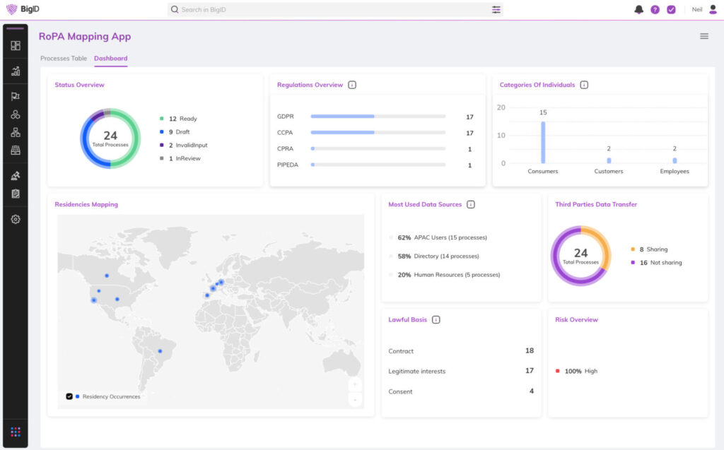 Utilize dashboards summarizing the key metrics gleaned from BigID apps. Dashboards are available out of the box and provide basic drill-down capabilities.