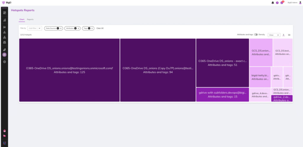 Identify, prioritize, and remediate your riskiest data through rich data sensitivity visualization and reporting. Automatically visualize your sensitivity hotspots – by size or by density. View hotspots across different attributes like sensitivity levels, tags, accessibility, and more. Drill down to analyze each hotspot for further analysis.