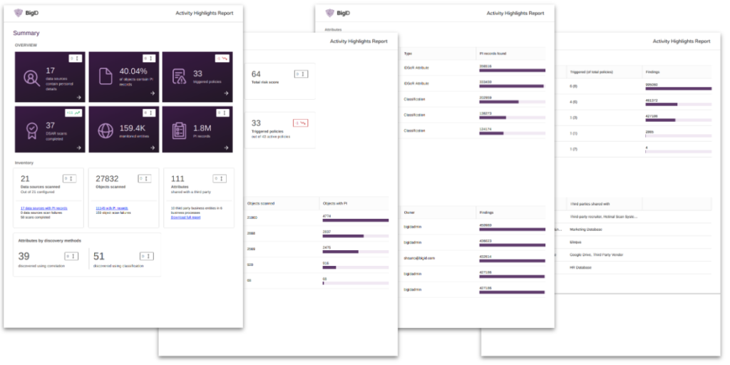 Utilize pre-defined reports generated automatically by BigID. Export in PDF format and send to the right people, on-demand.