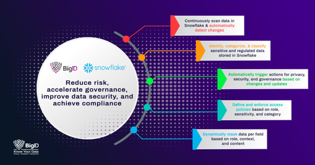 The Snowflake Data Cloud helps organizations maximize the value of their data – and with BigID, organizations can reduce risk, accelerate governance, and achieve compliance on their snowflake data.