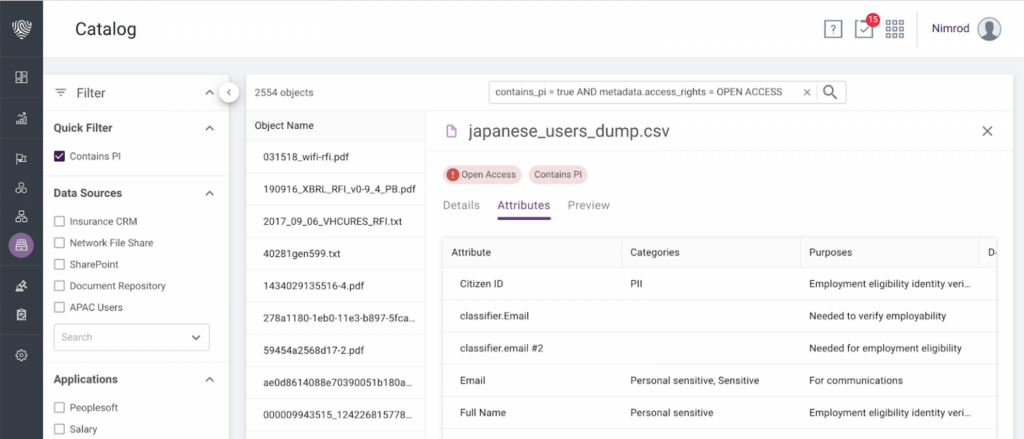 La classification avancée des données de BigID recherche, identifie et classe automatiquement les données réglementées telles que PCI et HIPAA, les données personnelles, y compris les PII et les PI contextuelles, les données NPI, les informations d'identification, les mots de passe et les clés de sécurité, les données IP et les types de documents.