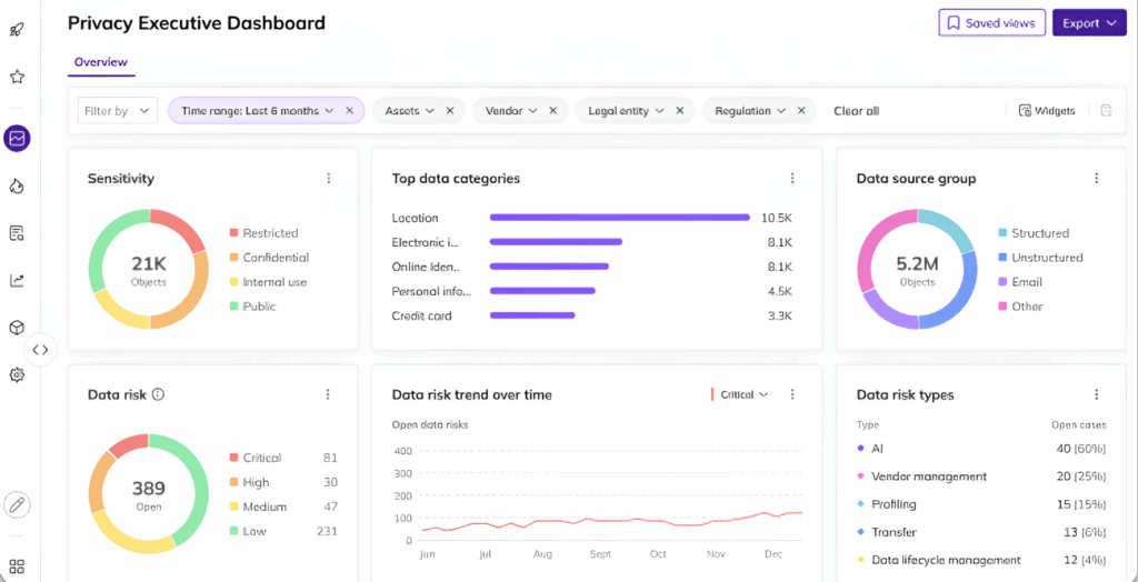 Optimice las evaluaciones de PIA e IA para evaluar el riesgo de privacidad a lo largo del ciclo de vida de los datos con descubrimiento de datos automatizado, plantillas dinámicas y puntuación de riesgo.