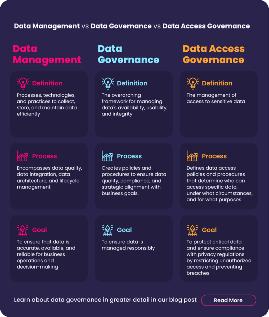 Robust data access governance uses a range of activities to achieve these objectives. It defines roles and responsibilities, sets up procedures for granting and revoking access, and audits data access regularly.