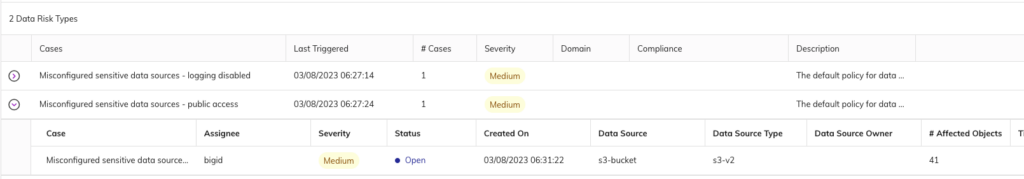 Centralize risk remediation with BigID’s Data Risk Management dashboard to accelerate your security operations. Get a prioritized list of misconfiguration alerts based on severity level measured by the sensitivity of that data that resides in the bucket. Drill down, investigate, and kick off seamless remediation workflows within a single pane of glass.