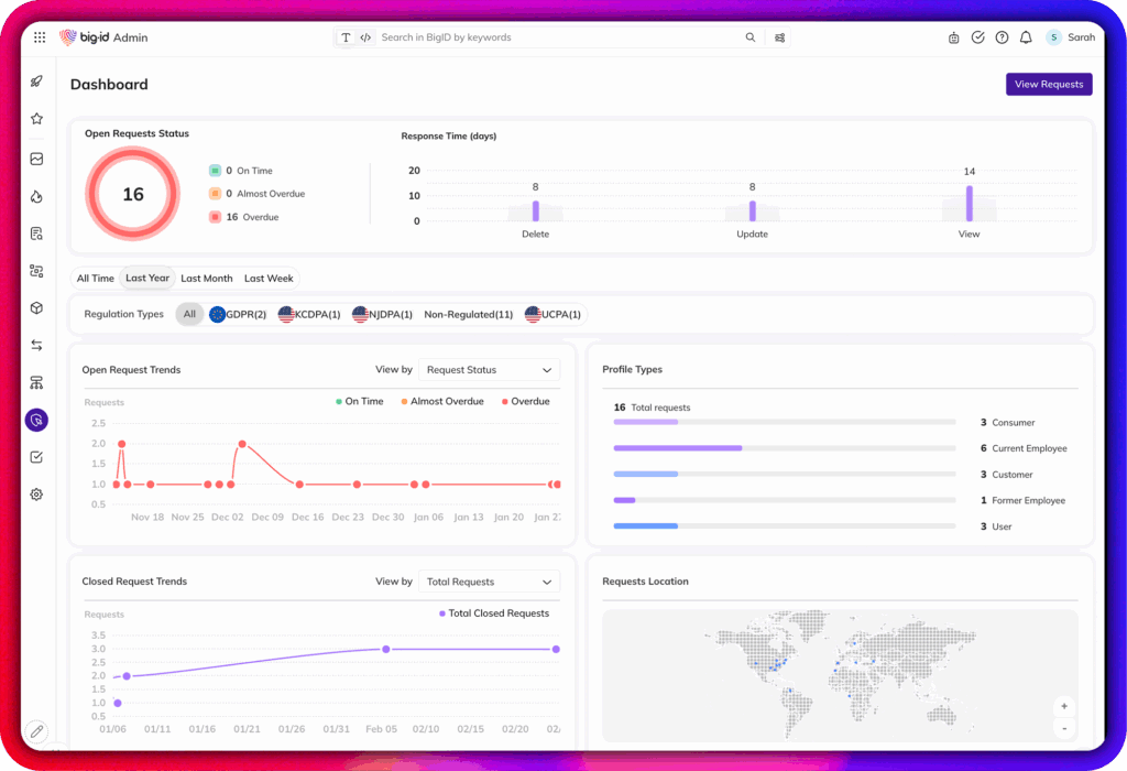 Gain real-time visibility into privacy posture, fulfillment metrics, risk exposure, and compliance alignment – all in one place.