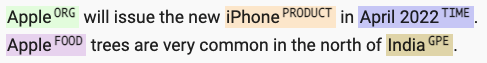 Another example where context plays an important role is being able to distinguish between entity types even if the word itself is the same. Using contextual clues, a model can learn that “Apple” is an organization in one context but it is a fruit in another context.
