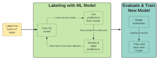 One way to reduce the amount of labeling work is to combine a machine learning model in the annotation process. The approach uses model predictions to pre-annotate new examples, allowing a human to then rapidly review these annotations, confirming or rejecting them as appropriate. This is an iterative process with the following steps: