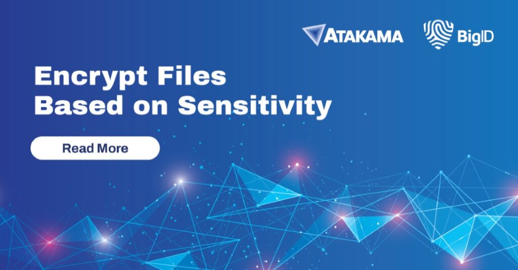Alongside Atakama, this integration enables organizations to apply adequate safeguards around their data, proactively manage risk, and maintain compliance. The joint solution helps mitigate user error by leveraging BigID’s unparalleled data classification and identification accuracy — plus enabling appropriate controls with Atakama’s innovative multi-factor encryption and distributed key architecture optimized around a data asset’s level of sensitivity. Per defined policies, Atakama protects files by automatically applying file-level encryption without relying on usernames or passwords.